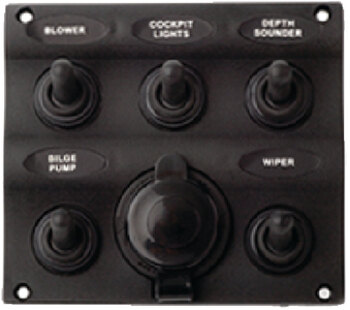 Fire resistant injection molded nylon. 6 illuminating switches. Not designed for total immersion. Panel rating: 12V/37 amps. Individual circuit: 10 amps max. Comes with mounting gasket and preprinted labels and fuses. Use #6 RH fasteners.