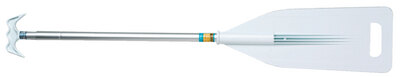 Corrosion resistant anodized aluminum construction with a high impact plastic handle. Handle has a positive non-slip cam lock with a built-in boat hook. Easy stowing and it floats!