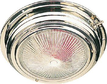 Highly polished stainless steel cabin light. Two illumination features: Bright White and Red. The red light is ideal for night time use. Heavy duty clear pattern glass lens. Built in stainless steel toggle switch. 15W/12V. 12V-6 CP bulb supplied. Fasten with #6 screws. Red replacement bulb #09871