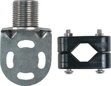 Stainless steel. Mount comes with nylon adaptors to fit 7/8", 1" and 1-1/4" rails. Standard 1"-14 thread. Can also be mounted to flat surfaces.